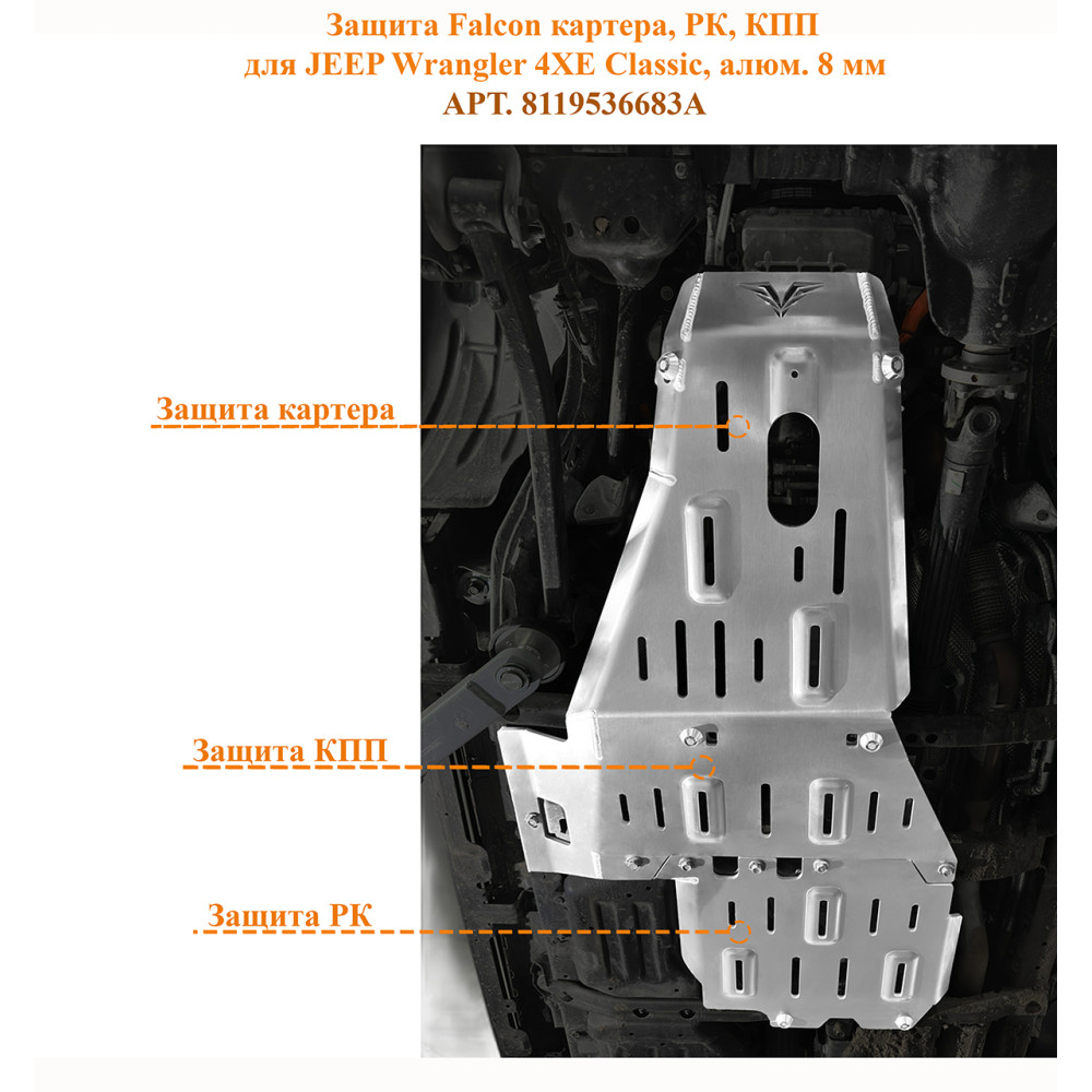 Алюминиевые защиты Falcon обеспечивают надежную защиту узлов и агрегатов внедорожника не только на бездорожье, но и в повседневной эксплуатации, особенно зимой или при наездах на оказавшиеся на дороге посторонние предметы.