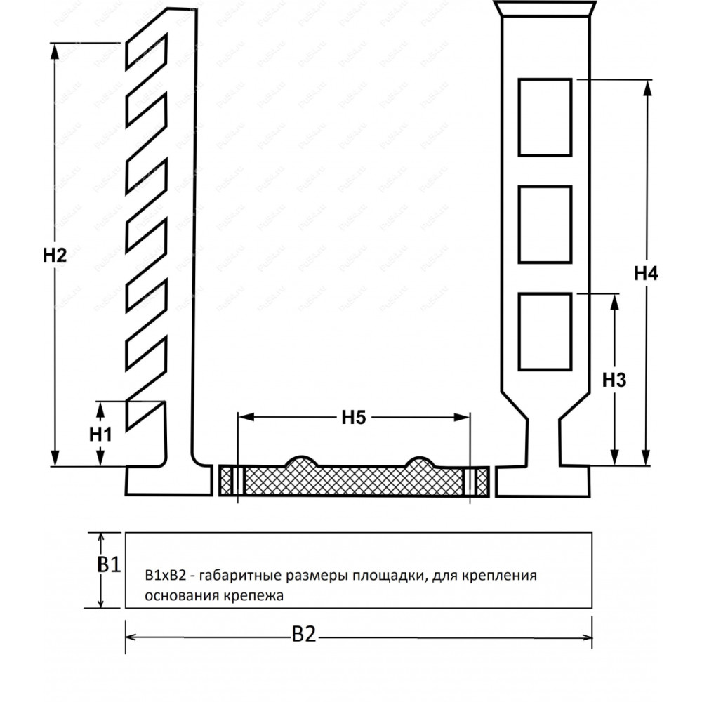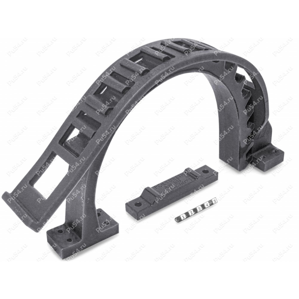 Зажим крепежный из прочного, износостойкого полиуретана. Конструктивно состоит из трех элементов, каждый из которых крепится на поверхность по-отдельности на нужном расстоянии: ремень с прорезями, ребристая часть, площадка опорная.