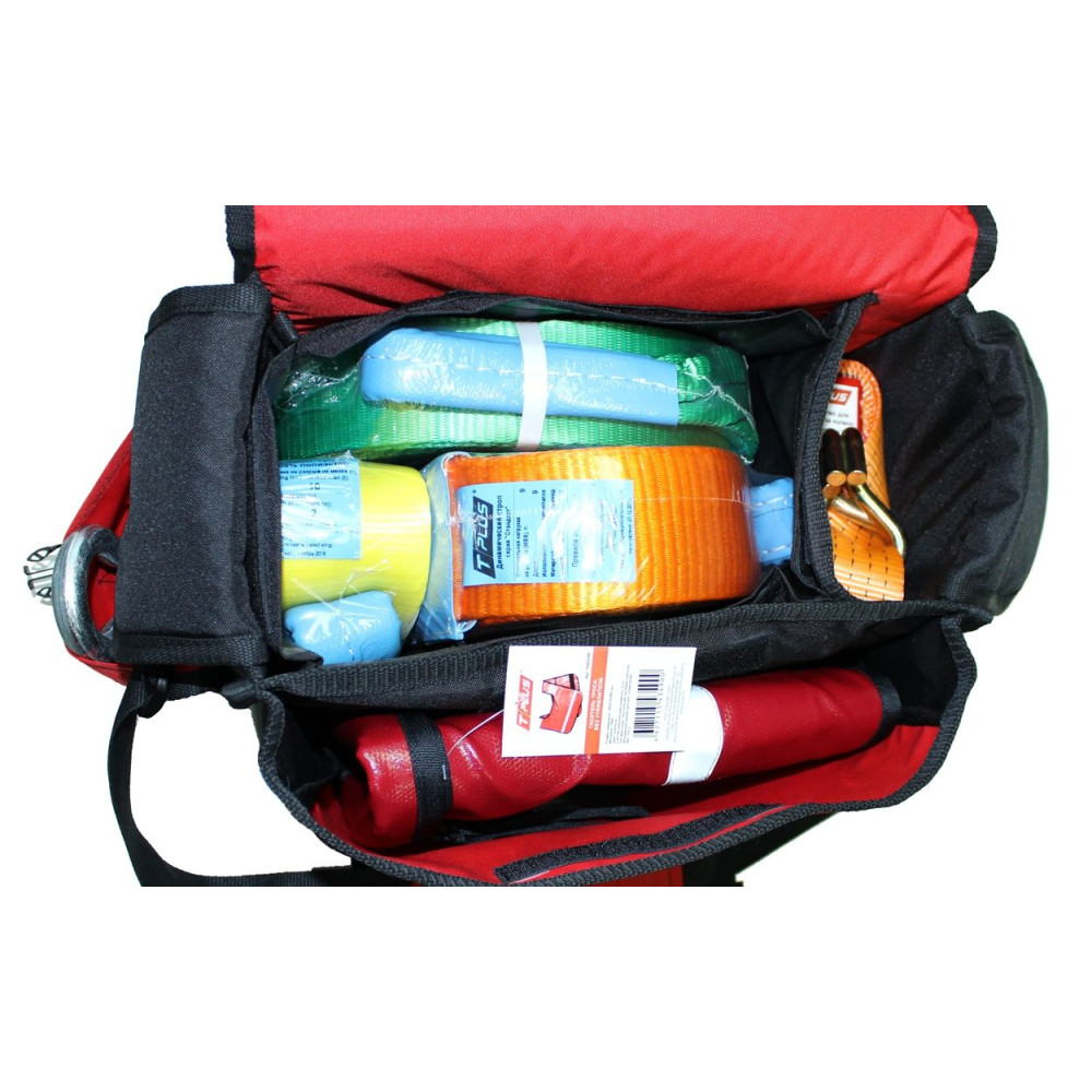 Большая сумка для такелажной оснастки разработана специально под сборку полного комплекта эвакуации: динамической стропы, корозащитной стропы, удлинителя лебедочного троса, блока для лебедки, гасителя троса, шаклов (скоб), перчаток и т. д.