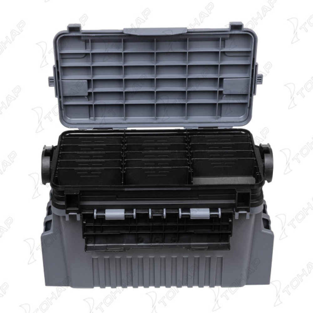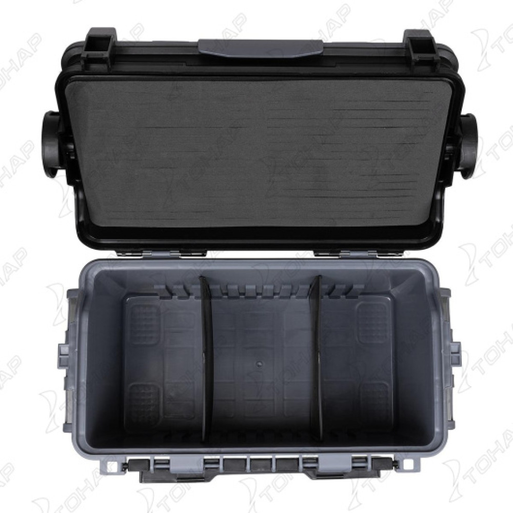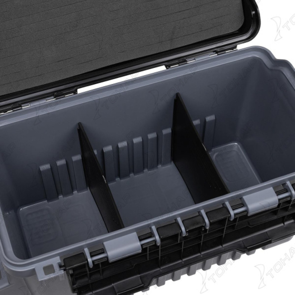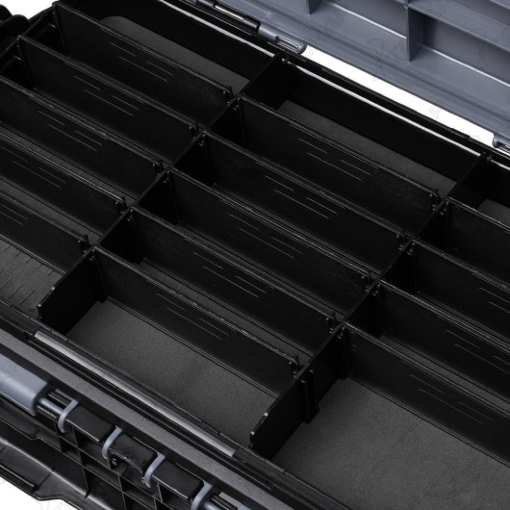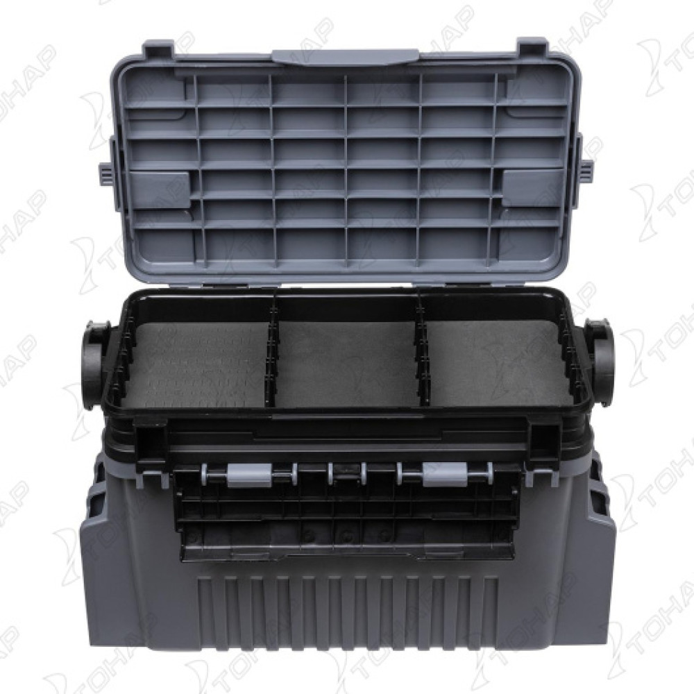 В ящике имеется 2 отделения. С внутренней стороны крышки есть полиуретановые вставки для крепления приманок.